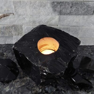 Mustast obsidiaanist küünlaalus. Laius ca 9 cm, kõrgus ca 5,5 cm.